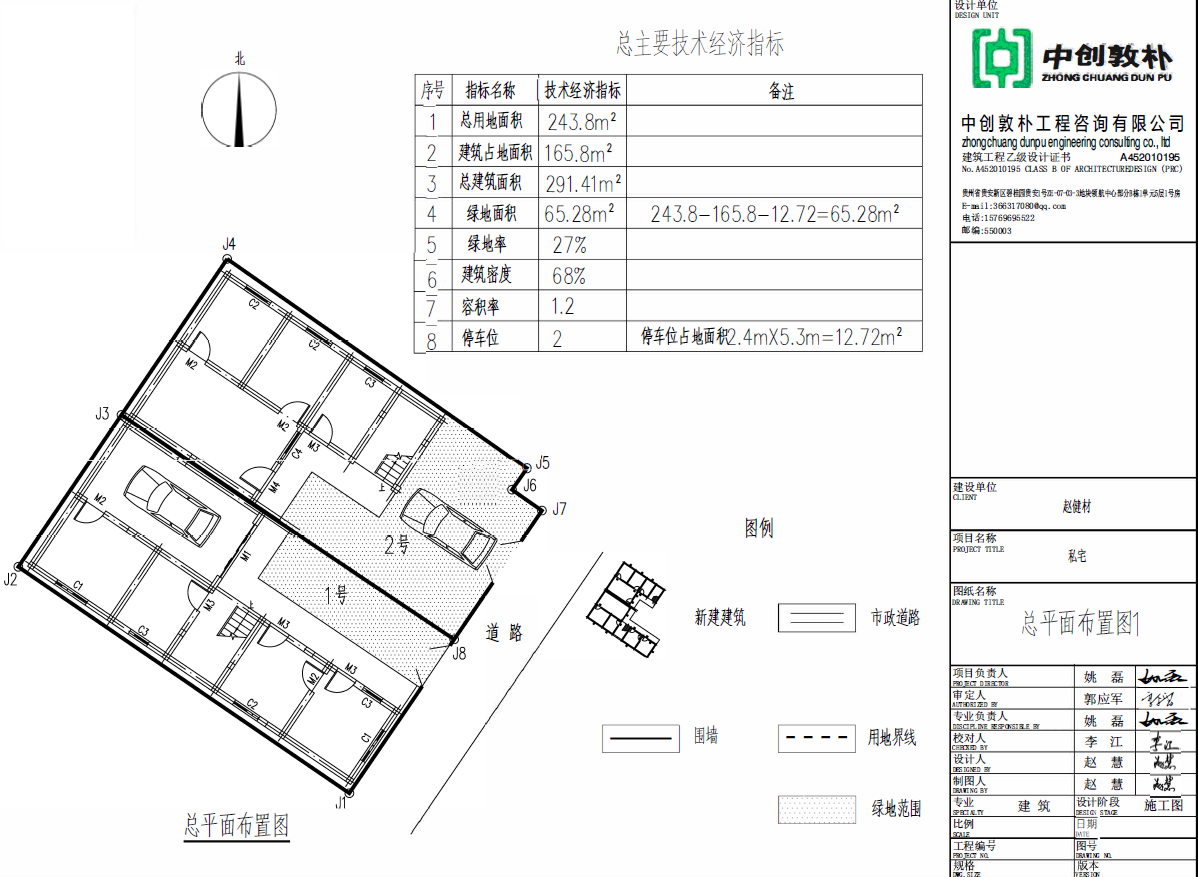 主要经济技术指标 | 用地面积:243.8平方米;总建筑面积:291.41平方米,建筑占地面积:165.8平方米;容积率:1.2;建筑密度: 68%;绿地面积65.28平方米,绿地率27%。停车位2个。 | |