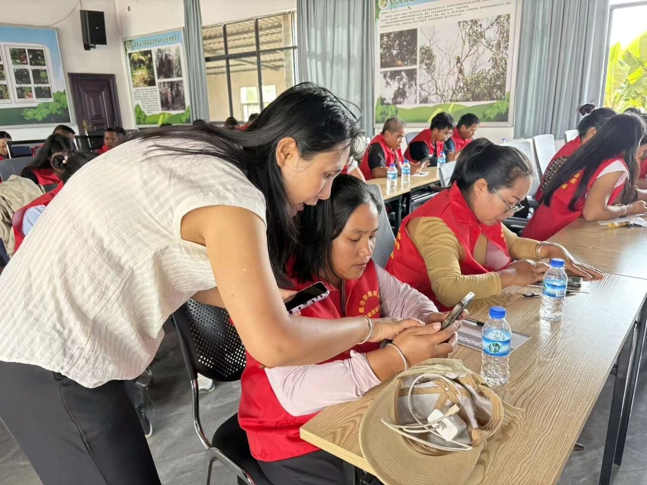 培训采用“理论课程+现场实操”模式,专门搭建模拟直播间,学员们分组上阵当“主播”,老师巡回指导补光灯摆放、产品展示话术等细节。现场气氛热烈,村民们围着屏幕反复调试角度,致富带头人更是拿着手机认真记录,时不时追问工具使用技巧,生怕错过关键内容。