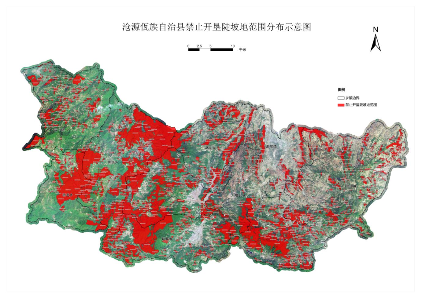 (一)根据划定成果,沧源佤族自治县共划定禁止开垦陡坡地面积65515.01hm2,占国土面积的26.77%,小斑数1065个,涉及沧源佤族自治县10个乡(乡)镇93个行政村和社区(班老乡下班老村、勐来乡拱撒村无禁止开垦陡坡地范围),禁垦坡度大于25°范围62470.84hm2,禁垦坡度小于25°范围3044.17hm2,主要分布于林地、草地和裸土地上。禁止开垦陡坡地范围,不涉及耕地保护红线和现有耕地。