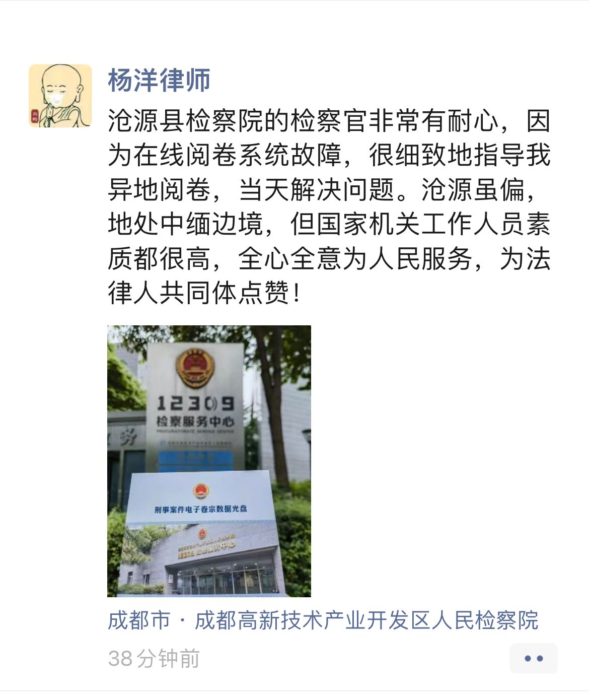 近日,沧源佤族自治县人民检察院案件管理中心接到了来自四川成都杨律师的异地阅卷申请电话。了解情况后,工作人员第一时间帮助杨律师在12309中国检察网完成了案件绑定、异地阅卷申请等一系列操作,后通过全国检察业务系统2.0向四川省成都市高新区人民检察院打包、推送了该案加密电子卷宗,并及时电话联系高新区人民检察院案管部门,不到半天时间,杨律师成功地在“家门口”的检察院拿到了案件的电子卷宗光盘,实现线上检察服务“零跑腿”。