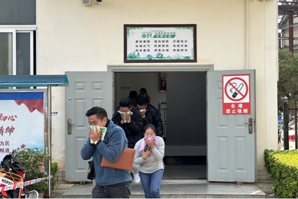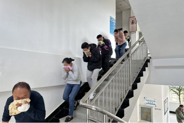 上午11时演练开始,当消防警报响起后,全体员工迅速捂住口鼻,低下身子,按照事前设定的逃生路线,迅速有序地撤出楼层到安全地带集合。同时,迅速拨打"119"报警。