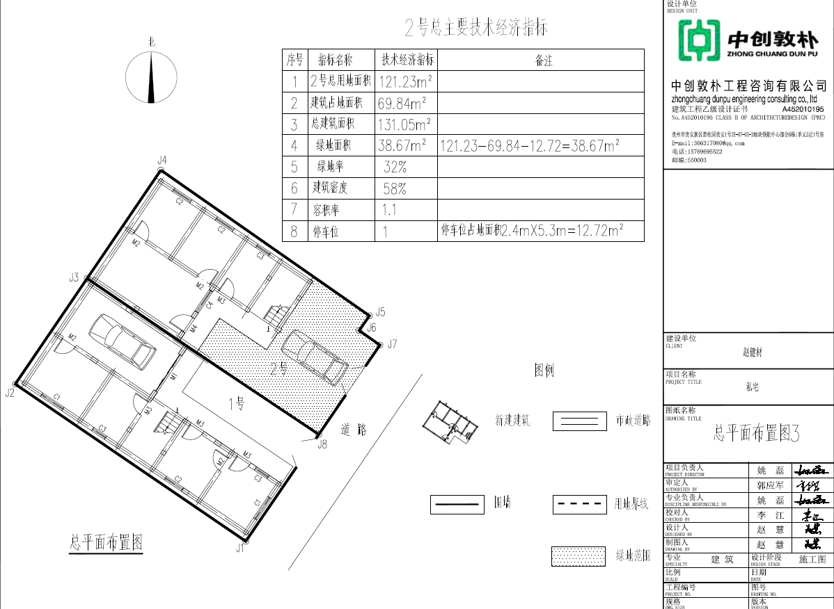 主要经济技术指标 | 用地面积:243.8平方米;总建筑面积:291.41平方米,建筑占地面积:165.8平方米;容积率:1.2;建筑密度: 68%;绿地面积65.28平方米,绿地率27%。停车位2个。 | |