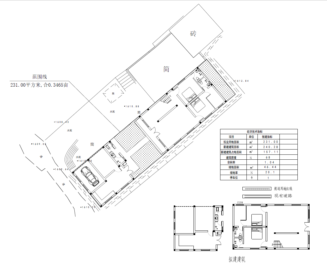 主要经济技术指标 | 用地面积:231.00平方米;总建筑面积:240.28平方米,建筑占地面积:157.11平方米;容积率:1.04;建筑密度:68%;绿地面积46.44平方米,绿地率20.1%。停车位1个。 |