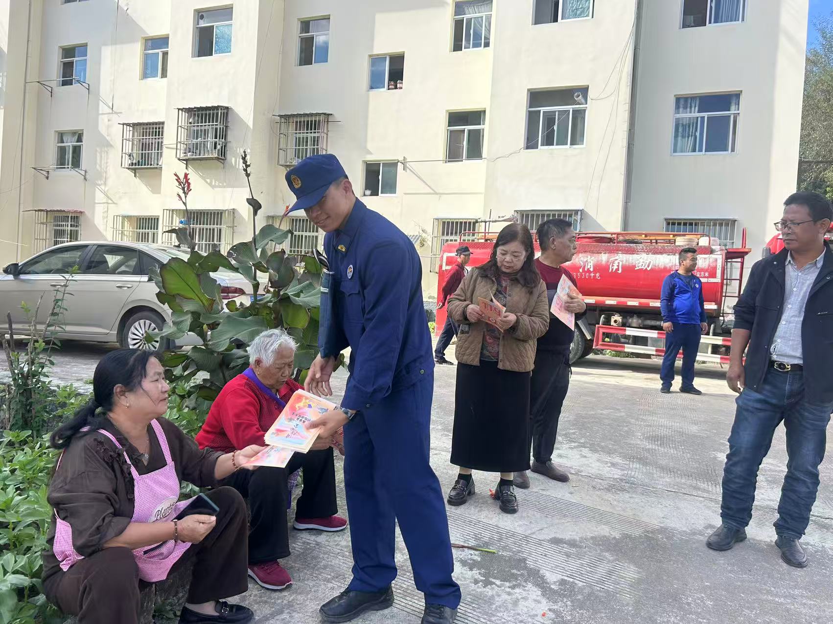 11月10日起,勐角民族乡开启多元化消防宣传模式。一是在乡会议室开展消防理论知识培训,工作人员通过“理论讲解+视频播放”的形式让参训的干部、群众清晰掌握火灾隐患识别方法;二是组织宣传队伍沿乡主干道开展街道宣传,队员们携带《小场所消防安全提示》《家庭防火手册》等资料,向沿街商铺、过往行人发放宣传册,同时在街子天悬挂横幅,现场教学消防防护罩正确佩戴方法,现场演示干粉灭火器“一提、二拔、三握、四压”使用口诀,帮助群众精准掌握基础预防技能。截至活动结束,共发放宣传资料100余份,实现消防知识“线上+线下”“集中+流动”全方位普及。