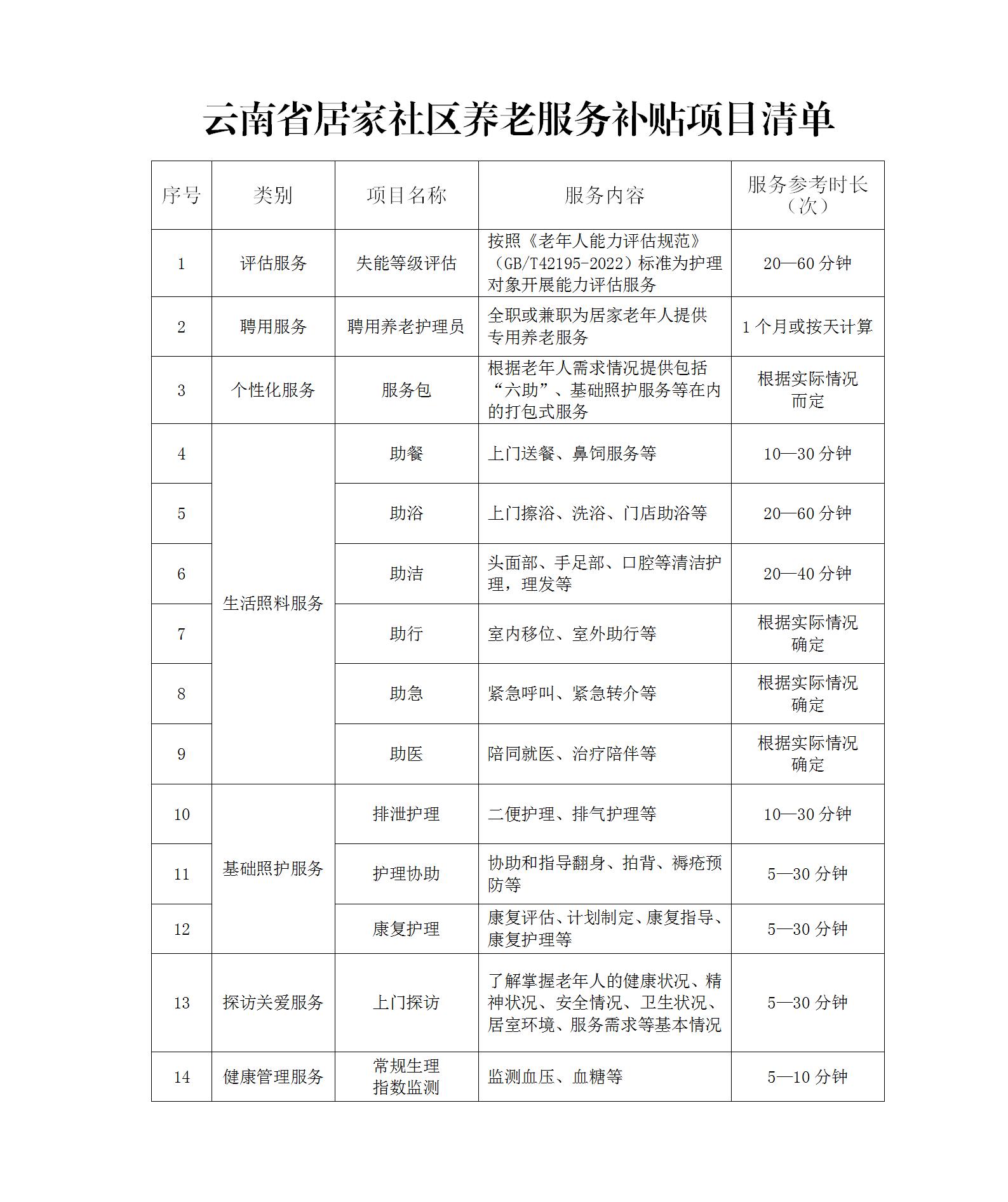 2.居家和社区养老服务:主要包括助餐、助浴、助洁、助行、助急、助医服务,以及康复护理、日间托养等服务。后续将根据中央要求和实施情况适时进行调整。具体项目清单详见《云南省居家社区养老服务消费补贴项目清单》。